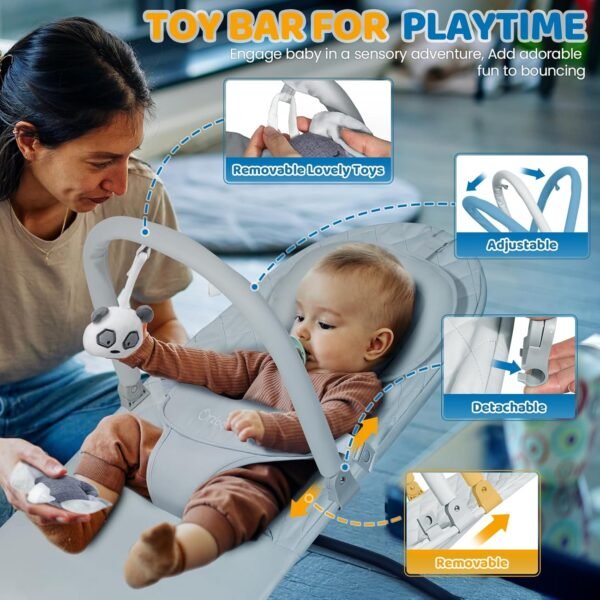 Introducing the Orzbow Baby Bouncer, designed to make parenting easier this summer! Crafted by mothers for mothers, this ergonomic seat features three adjustable recline positions, ensuring your little one enjoys comfort while playing or napping. Its lightweight, foldable design makes it perfect for home or on-the-go use. Safety is a priority with a 3-point harness and ASTM certification. Plus, the removable play bar enhances sensory development, making every moment fun and engaging for your baby.