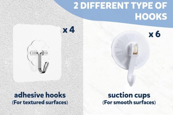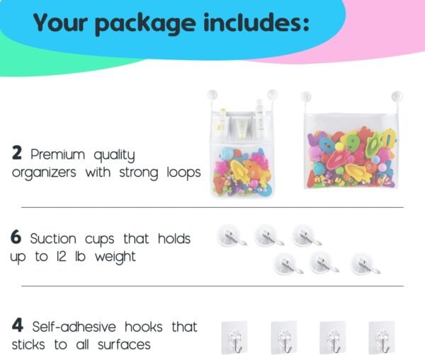 Bought this set because it was supposed to come with both the suction hooks and the self adhesive hooks, but it didn’t not come with the self adhesive hooks. I read from other reviews that the suction hooks are pretty much hit or miss and it did not work on my tiles and the mesh bags fell off within half an hour. And since these did not come with the other set of hooks these were a definite return. Ended up buying the Munchkin bath toy storage which is smaller but MUCH better.