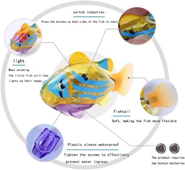 Introducing the Electric Fish Toy—a delightful addition to bath time fun or pet play! Crafted from high-quality ABS material, this durable toy features mesmerizing LED lights and lifelike tail movement, mimicking real fish swimming. Measuring approximately 8×3.5cm, each fish operates on two included LR44 batteries, ensuring 45-60 minutes of captivating activity. With five colorful fish included in the package, your child or pet will have endless enjoyment in the bathtub, sink, or pool!