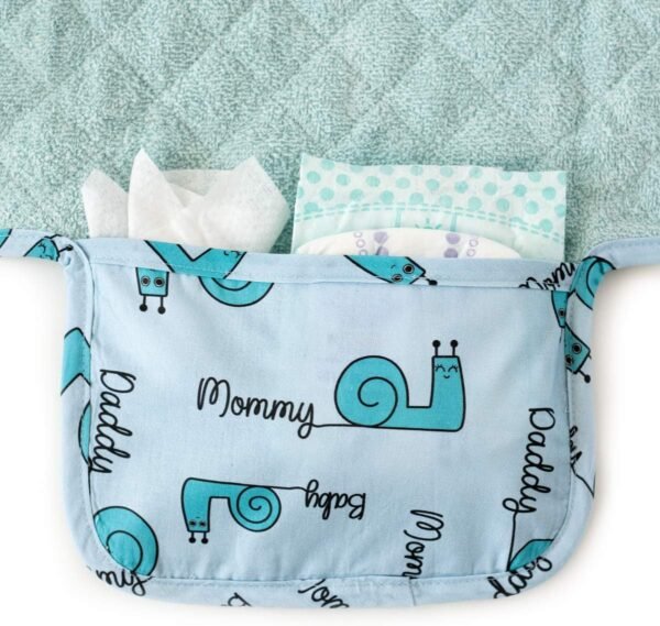 The practical design includes turn-up sides and a reinforced mesh pocket to neatly store wipes, rash cream, and powder. You’ll appreciate the waterproof polyurethane coating, which makes cleaning a breeze and keeps the pad fresh for future uses.