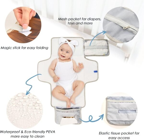 Make diaper changes a breeze with our all-in-one waterproof changing mat. Crafted from 100% polyester, it’s soft on your baby’s skin yet durable enough for daily use. Its compact design (closed: 11.8×8.3×1.4 in) fits perfectly in diaper bags and attaches easily to strollers or car seats. Featuring a padded head pillow and ample space (11.8×24.4 in), this mat ensures comfort for newborns and toddlers alike. With easy-to-clean surfaces and smart storage pockets, it’s the must-have accessory for today’s on-the-go parents.
