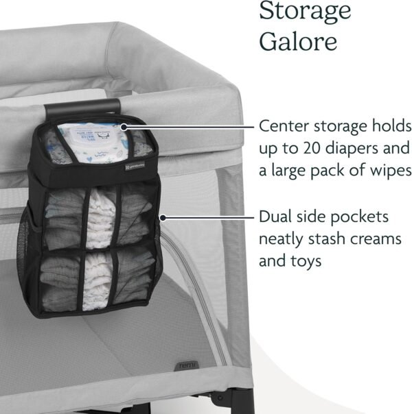 Keep your baby’s essentials organized with the Changing Station Organizer for the UPPAbaby Remi Playard. This convenient accessory ensures everything you need—diapers, wipes, creams, and toys—is within easy reach. Featuring a simple clip-on design, the organizer attaches effortlessly to the Remi. With dual side pockets for creams and toys, and a spacious center compartment to hold up to 20 diapers and a large pack of wipes, this organizer enhances your changing routine. Plus, it’s GREENGUARD Gold Certified, promoting healthier air quality with low chemical emissions.