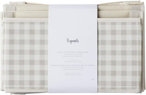 I love the aesthetic of this for a baby’s room, the design is so soft, neutral, and sweet with the gingham in beige. I like that it comes with matching beige plastic hooks for hanging it, only they need to be stretched a little bit to fit over the door and they are quite thick (couldn’t close the closet door I tried it on). I also like it comes with material inserts to reinforce the bottom of each compartment as well as thick cardboard, cut out pieces to reinforce the side panels. Side panels slide into the intended slits on either side. The only bummer is that there was missing a side panel, they only included 7 instead of 8. We’ll have to make one ourselves.In terms of design, the compartments could’ve been spaced out more to make it easier to fit things in. As it is, the only one you can really fit tall things in is the one on top, and the rest you have to kind of squeeze in through a small gap. They seem to show items sticking out like plushies that are held in place by the top compartment so maybe that was thinking with this design.I have a few over the door organizers, and I feel like it could be a little bit roomier; bigger or longer. If you’re going to take up the space on the back of the door might as well get more storage out of it. Maybe it’s made shorter so that tiny humans can’t get into it? Could at least be wider.So while it’s very pretty, it could be made better.I have the 3 sprouts foam interlocking play mat that’s great quality. This is more for the style than function. Costs 35$. Depends what you’re after, a display or real storage solution. For real storage I’d keep shopping as there are better options available, just not as pretty!