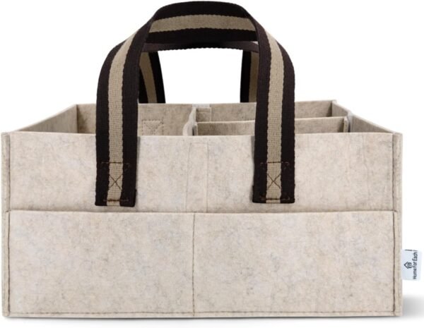 Like other reviewers have noted, this diaper caddy organizer has nice, soft straps that are very thoroughly sewn onto the bag and are very durable. The handles were softer than I expected, though the felt bag was not as soft as I had expected. The felt is very thick and smooth, so easy to clean but not as soft as most felt is. The bag is also not as deep as I had expected. It is kind of shaped like a cardboard box – unusually square for a bag. The divider is held in place with velcro to give you three sections, but it can be removed if you just want a large open bag. The entire outside of the bag is lined with more pockets, so you won’t run out of places to put things.Because this bag remains open on top and has so very many open slots, this would make a great diaper caddy for busy moms, so they don’t have to go digging around for items they need while their infant is crying, because everything remains easy to carry but entirely visible on display. However, it would also work well to carry fruit, since the felt bag prevents anything from getting bruised, or for carrying many items through a security checkpoint, because you’ll probably just get waved through, since you’re clearly not trying to hide anything. This is the carry-on bag to take on an airplane with you. Not only can you find and grab any item you need quickly and easily on the flight, but you won’t be stalled much getting through the TSA screening area.
