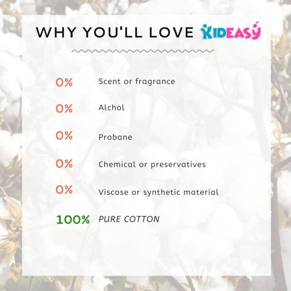- Natural & Safe: Crafted from pure cotton, KidEasy Wipes are free from chemicals and fragrances, making them safe for sensitive skin.
