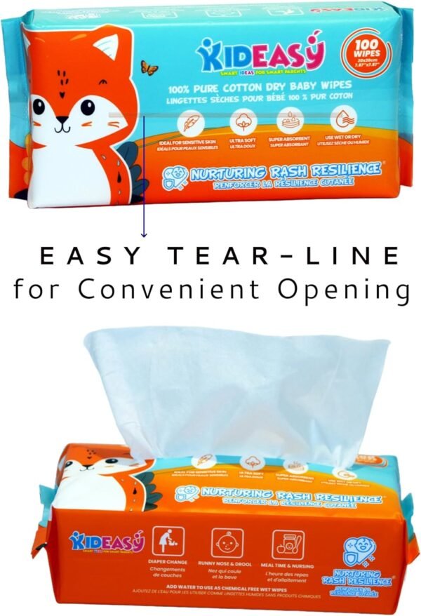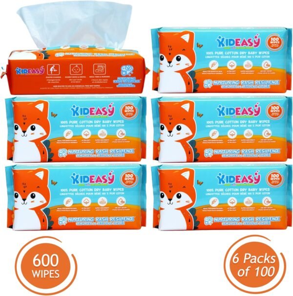 Discover the ultimate solution for all your baby’s messy moments with KidEasy Dry Wipes. Made from 100% pure cotton, these wipes are chemical-free and devoid of synthetic additives, ensuring a gentle touch on your baby’s delicate skin. Whether you need to clean up after mealtime, change diapers, or wipe away drool, these super thick and strong wipes handle it all effortlessly.